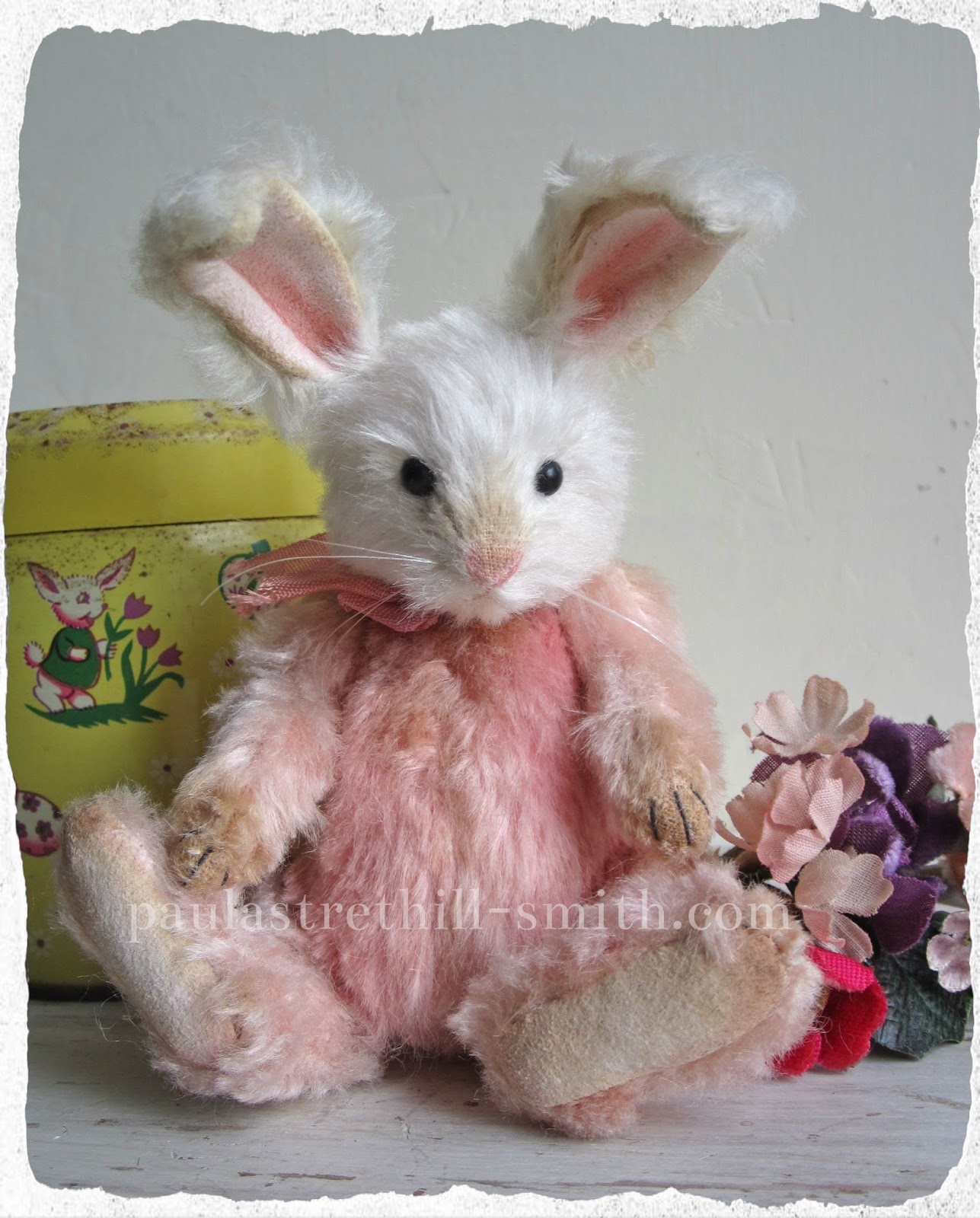 Happy Easter Bunny 6" high to tip of his ears created from vintage hand dyed plush in old white and pale pink shades.Happy Easter Bunny has a wobble neck joint matt eyes.His ears are lined with suedette tinted and wired so they can be posed up or down.