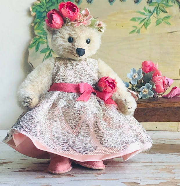 Madame Rose is trimmed with vintage millinery Roses and tiny forget me nots.